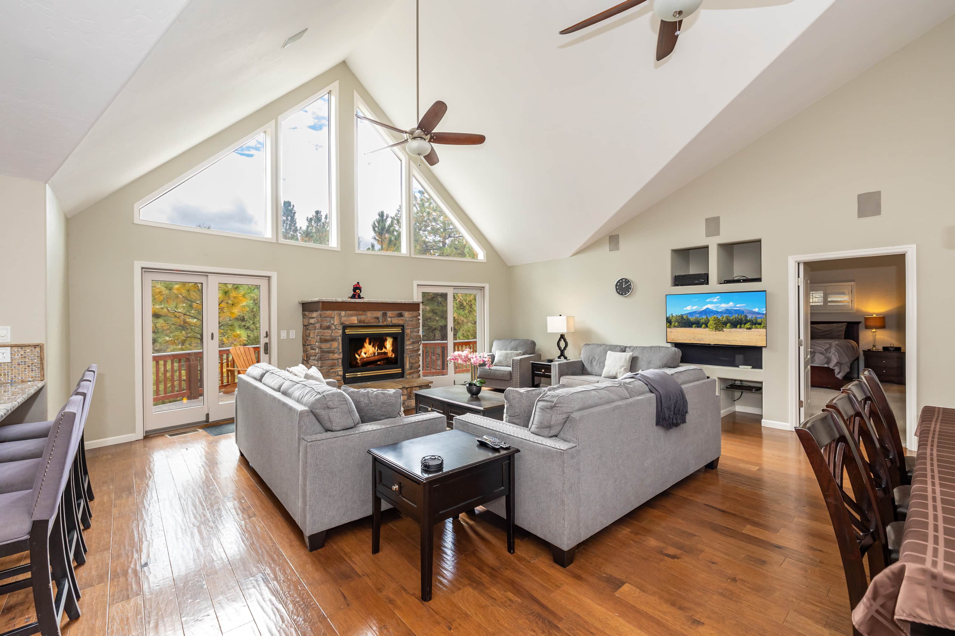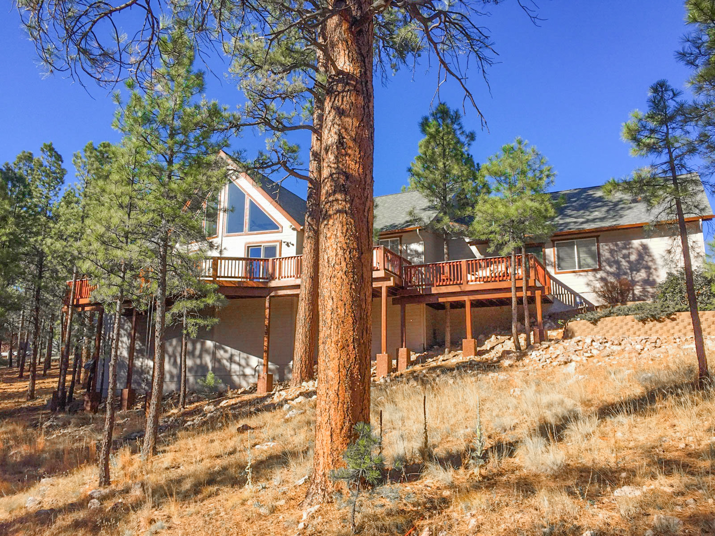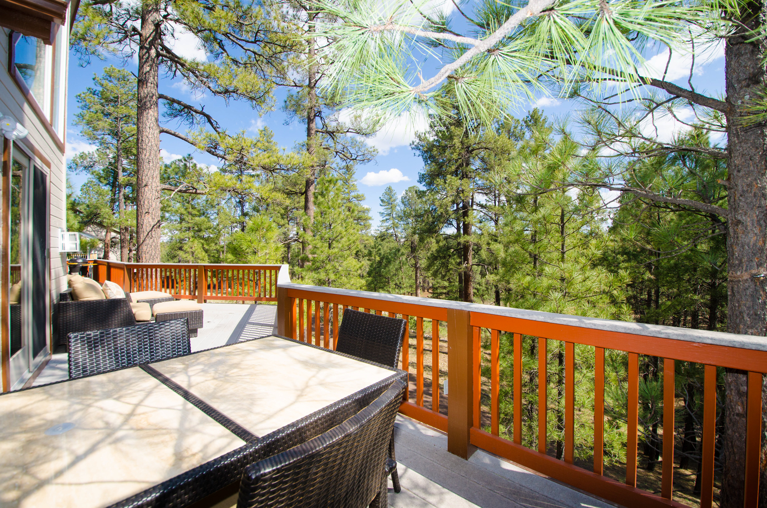 This renovated single level home features a large chef's kitchen, 4 bedrooms and 3 full bathrooms and a hot tub on the large rear deck! Luxury finishes include new hardwood cabinets, hand scraped wood floors, gorgeous kitchen and custom travertine bathrooms. The large rear deck is elevated above the pine forest and the Flagstaff Urban Trail system where you can hike and bike on over 50 miles of trails! There are 2 master bedrooms with each containing a deluxe king size bed, HDTV w/ TiVo and a spa like bathroom suite. The sizable 3rd bedroom has a queen size bed while the 4th bedroom has 2 full size (double) beds. The home will comfortably sleep 10 people with an additional 2 people on an inflatable queen size bed. From inside this gorgeous home, you will enjoy the beautiful scenery of the ponderosa pine trees seen through the dramatic great room windows that extend upward towards the peaked ceiling.