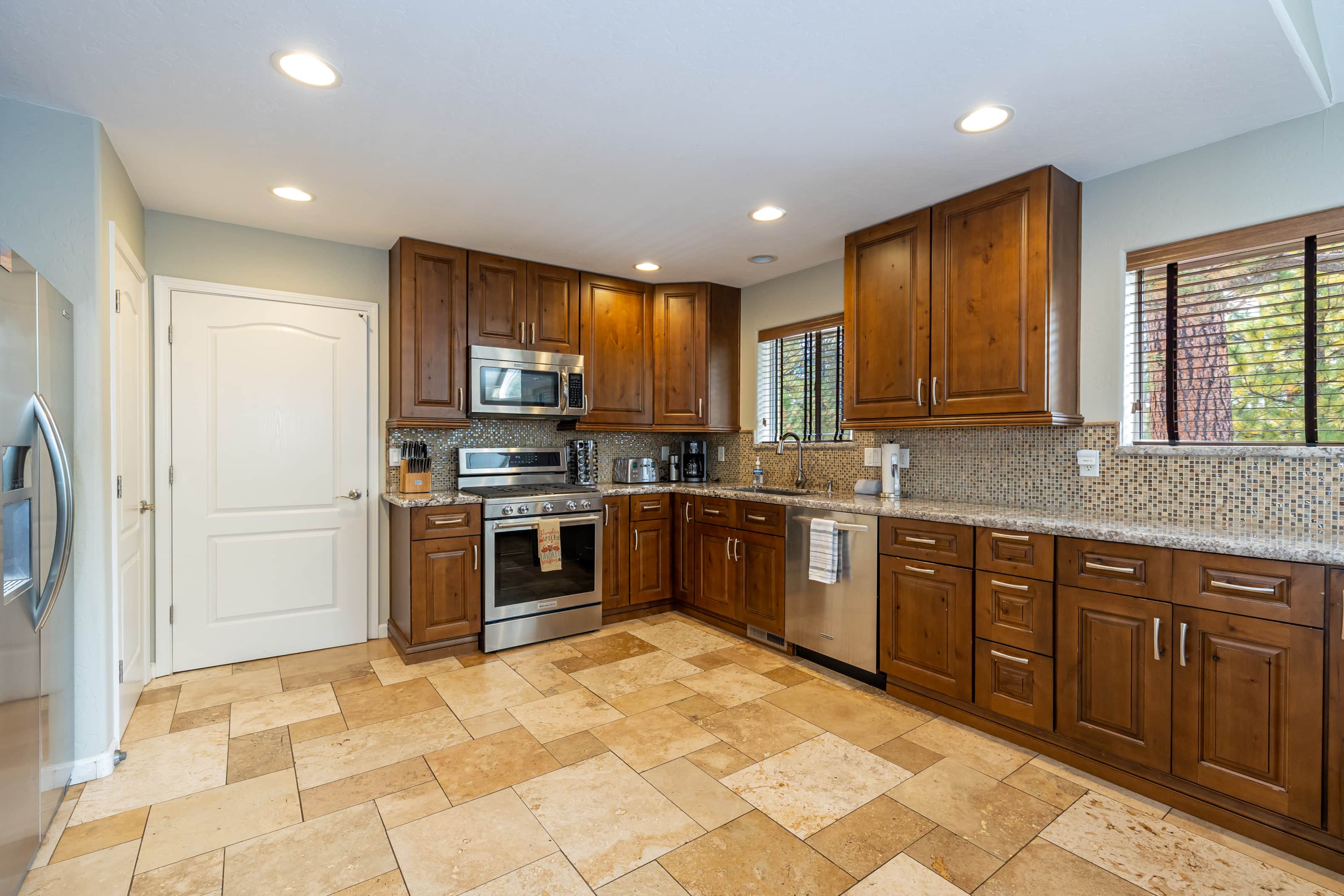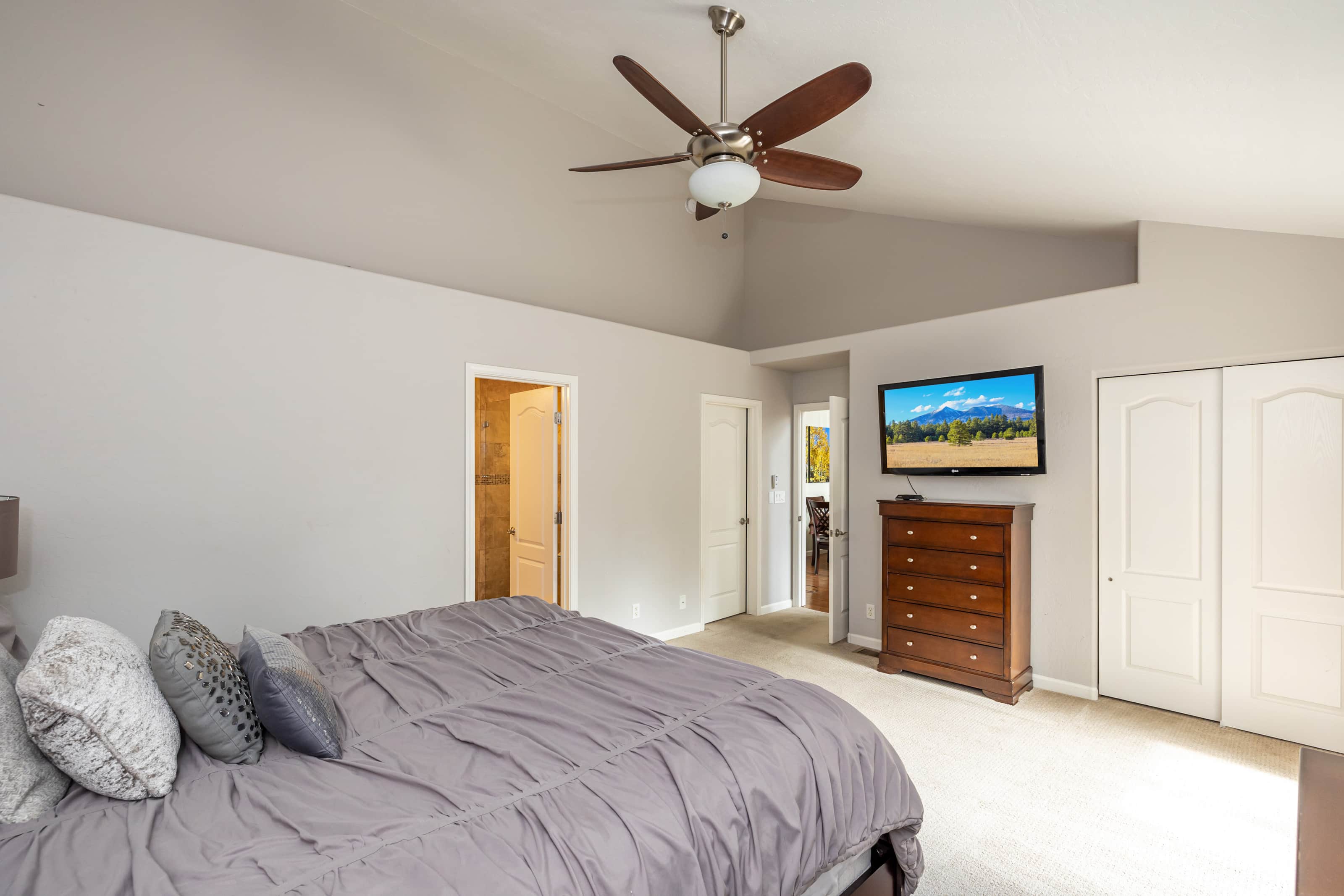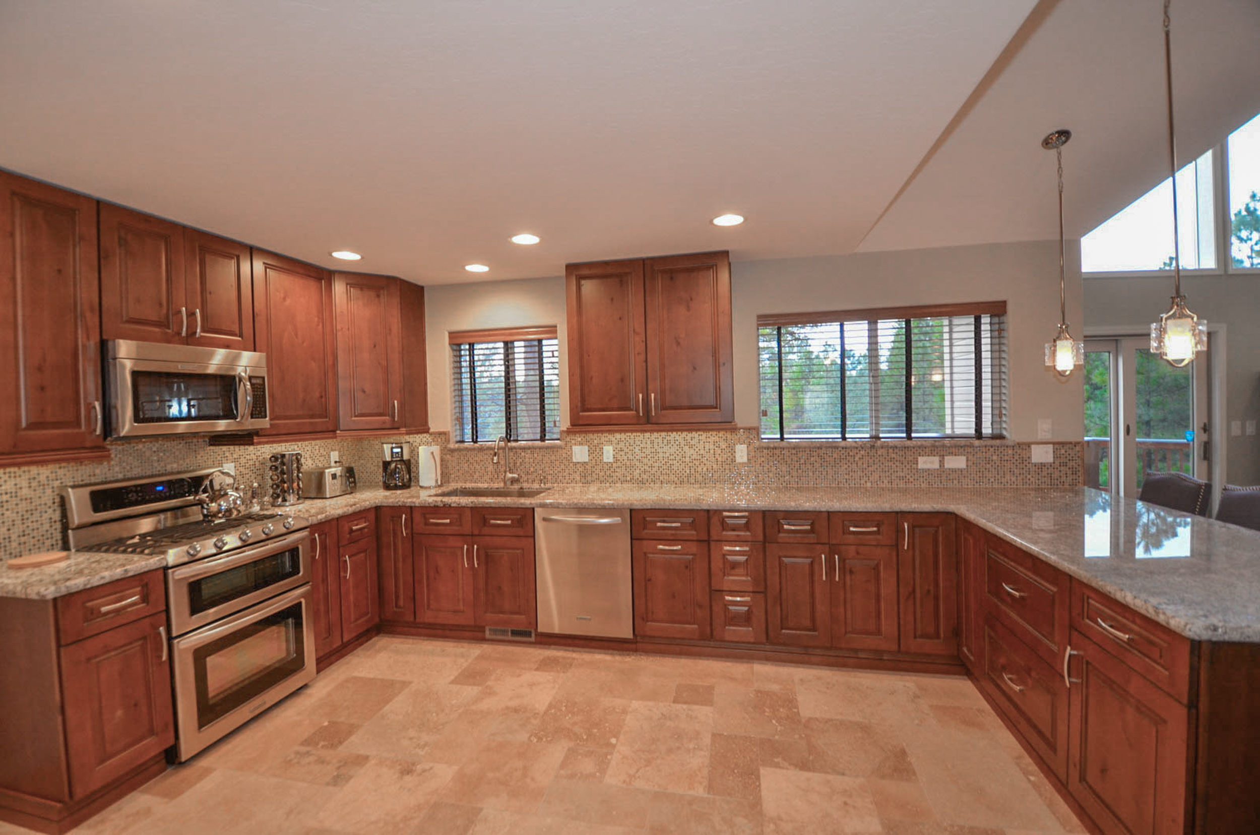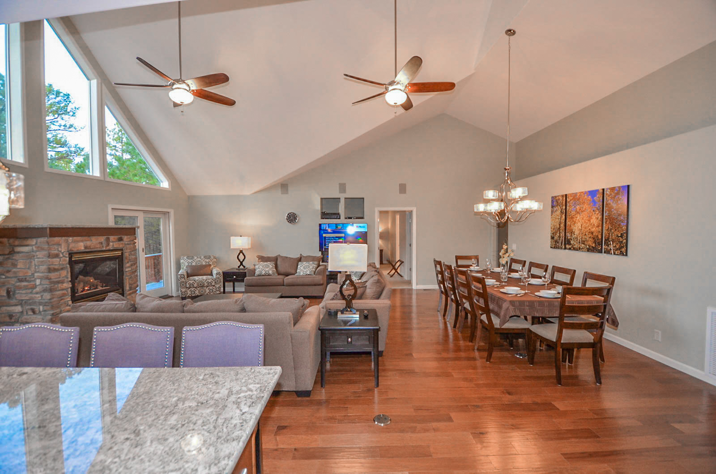 This renovated single level home features a large chef's kitchen, 4 bedrooms and 3 full bathrooms and a hot tub on the large rear deck! Luxury finishes include new hardwood cabinets, hand scraped wood floors, gorgeous kitchen and custom travertine bathrooms. The large rear deck is elevated above the pine forest and the Flagstaff Urban Trail system where you can hike and bike on over 50 miles of trails! There are 2 master bedrooms with each containing a deluxe king size bed, HDTV w/ TiVo and a spa like bathroom suite. The sizable 3rd bedroom has a queen size bed while the 4th bedroom has 2 full size (double) beds. The home will comfortably sleep 10 people with an additional 2 people on an inflatable queen size bed. From inside this gorgeous home, you will enjoy the beautiful scenery of the ponderosa pine trees seen through the dramatic great room windows that extend upward towards the peaked ceiling.