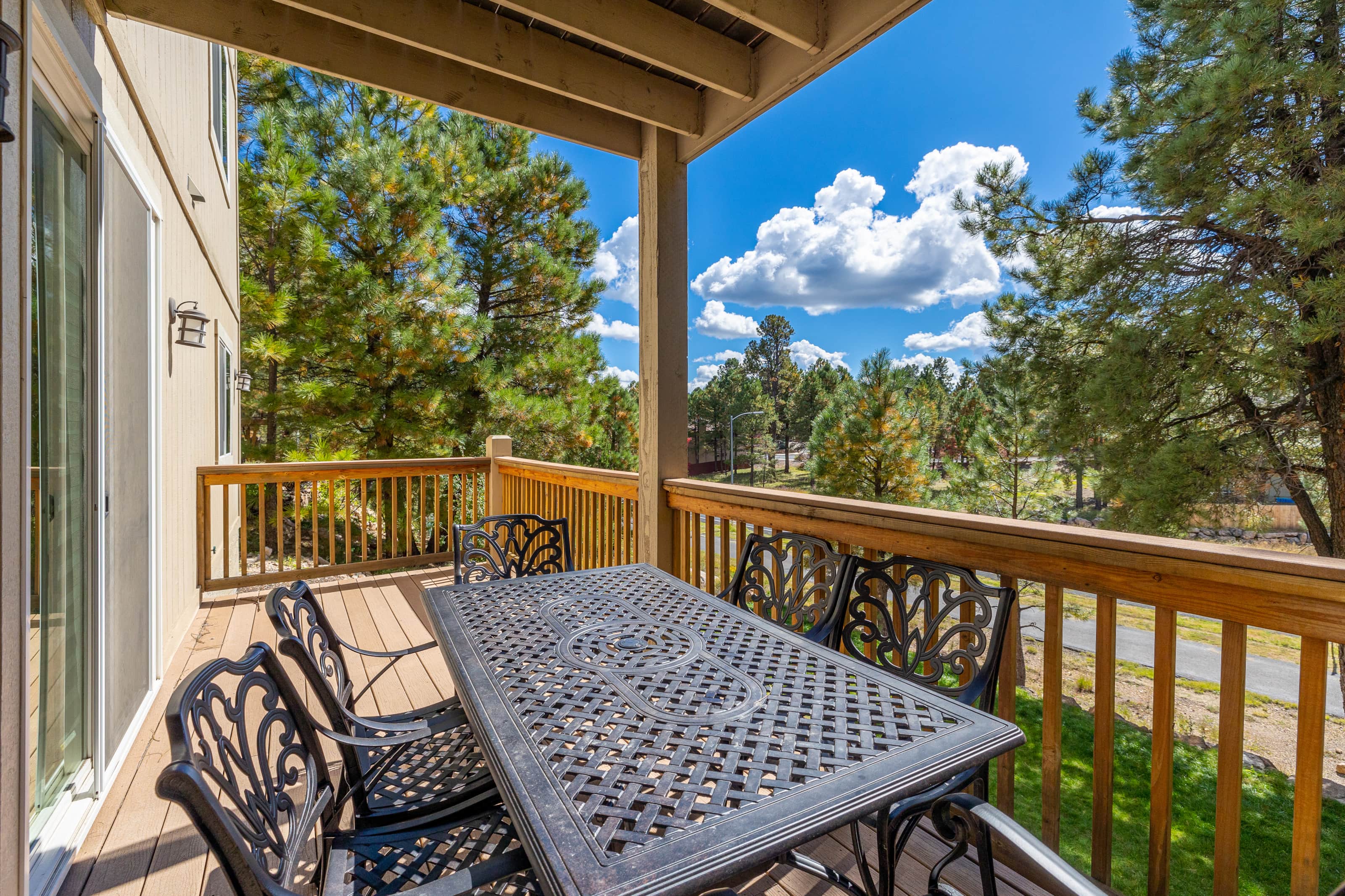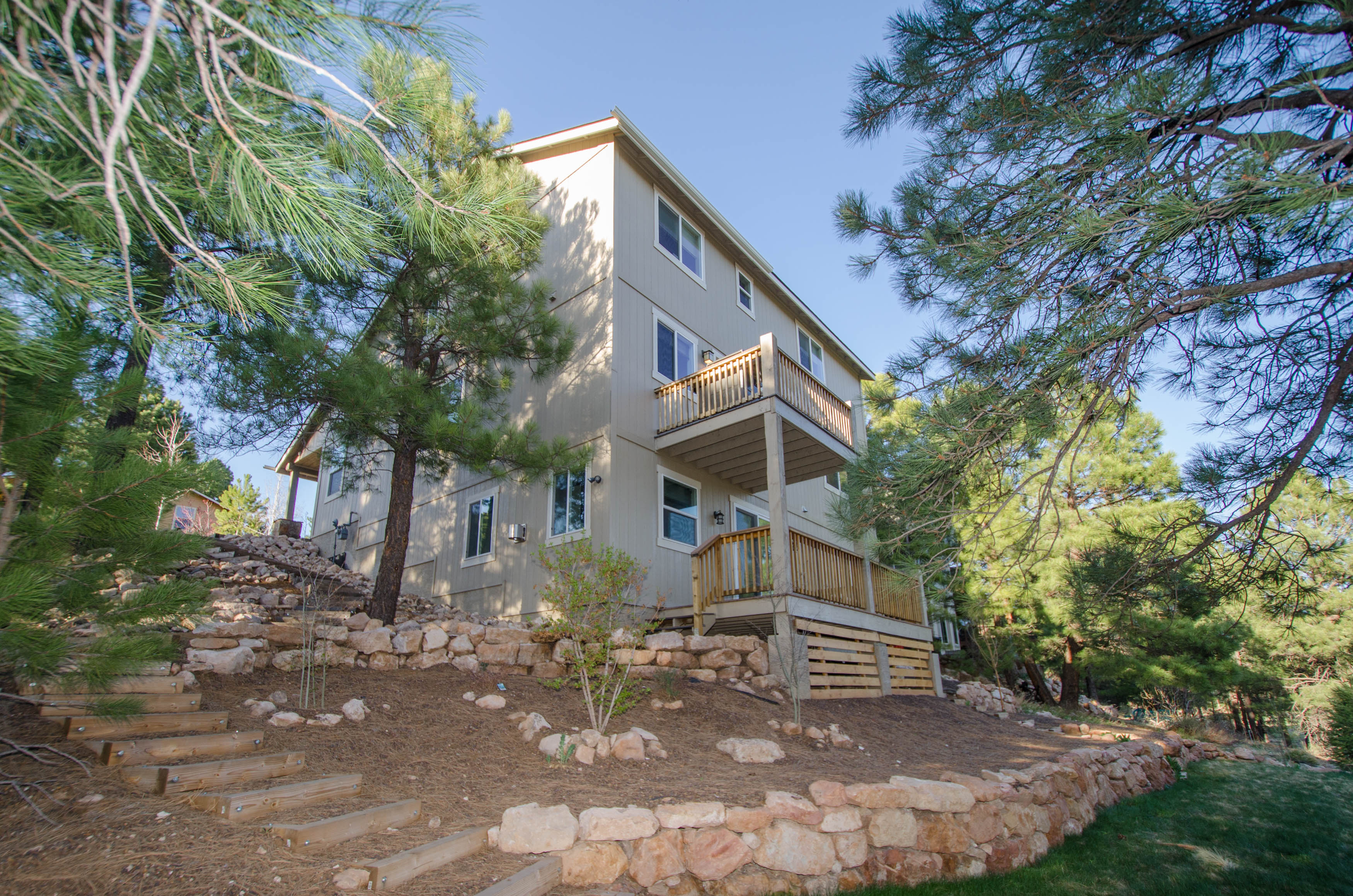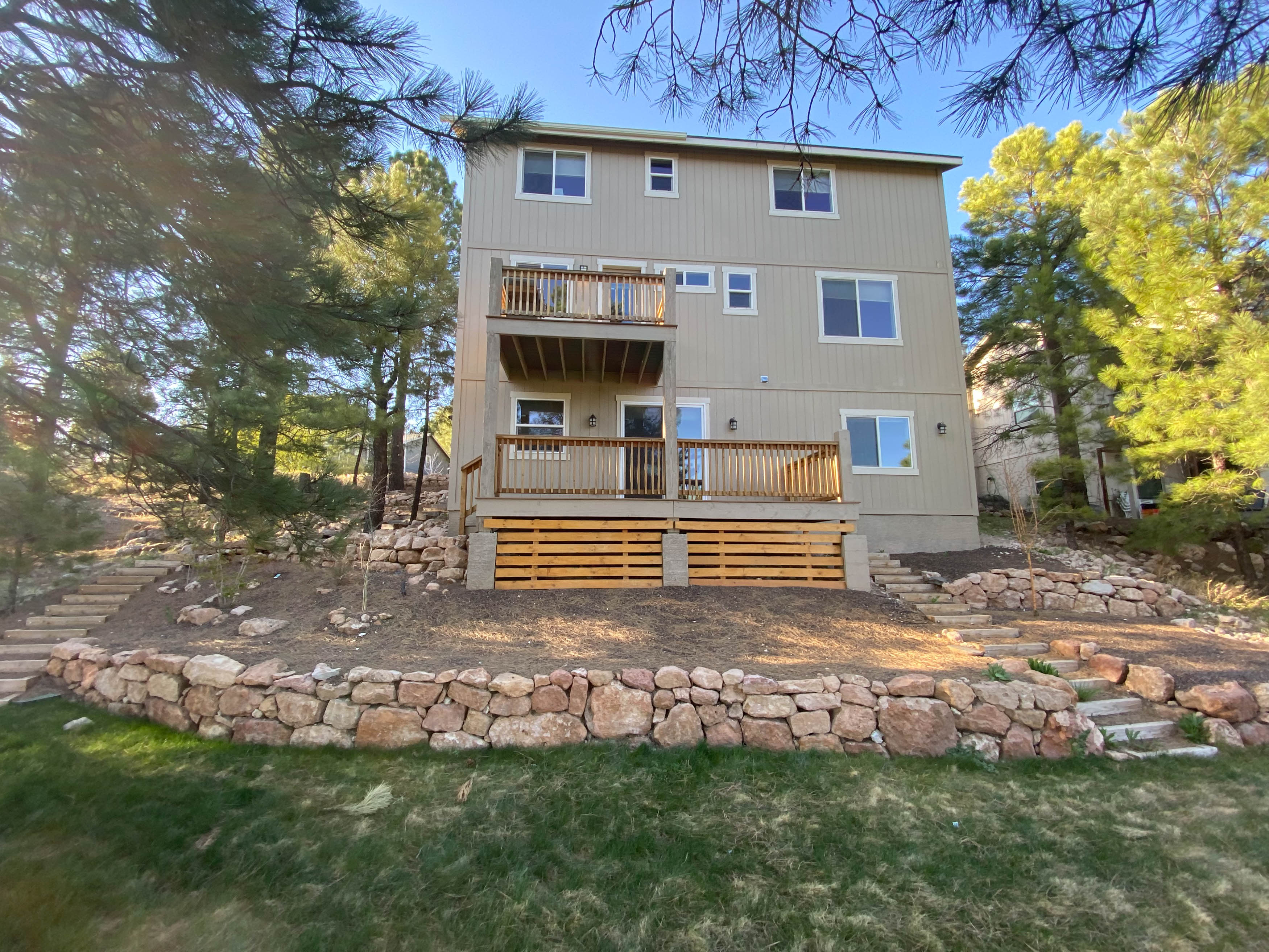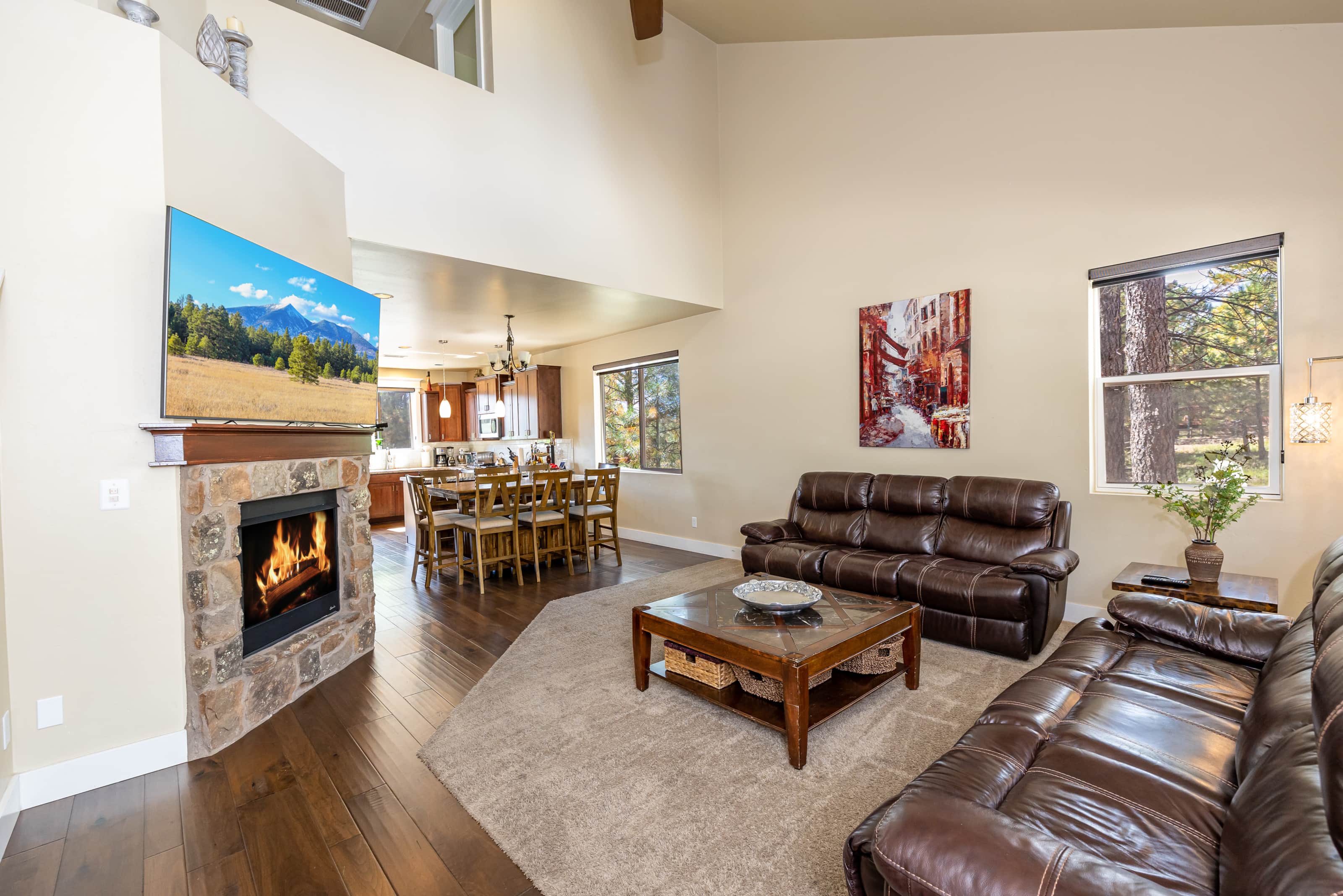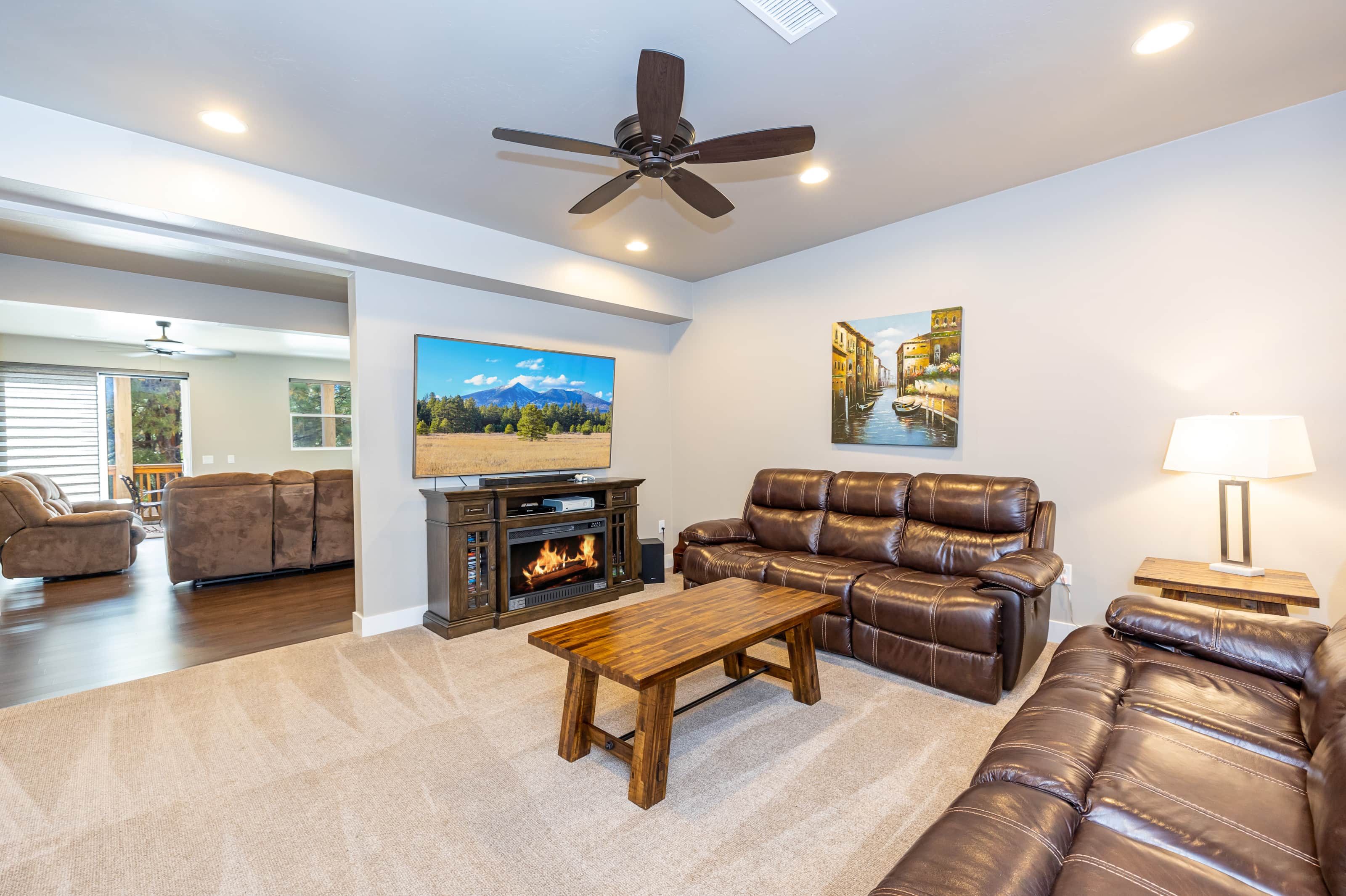 Amongst the high country pines and adjacent to a designated community open space this Flagstaff retreat is mountain living at its finest. The main level boasts an open concept floorplan with a grand fireplace, vaulted ceilings and a beautiful modern kitchen. The master suite is also located on the main level with an ensuite custom bathroom and large walk in closet. As you walk up the stairs and land on the upper level you are met by a large loft style landing, 3 additional large bedrooms with walk in closets, a full bathroom and a large laundry room. A fully finished 1207 s/f walk out basement is the icing on the cake with a large living/media room, adjacent office/gameroom, private bedroom, stylish bathroom and an amazing walkout deck. This home has 3 levels with the master bedroom featuring a king bed, living room, kitchen and dining area all on the main ground level. Upstairs you will find 3 bedroom along with the laundry room. The first of these bedrooms has a queen size bed and the remaining two each have a bunk beds with the lower bunk being a full size bed and the upper bunk having a twin size bed. Downstairs in the walk-out baseement area, you will find a 2nd master bedroom with king size bed. There are two large additional large living areas with large screen TVs, fireplace, balcony and even another bunk bed set with a full size lower bunk and twin upper. The home backs up to the community trail system with hiking and biking trails that will lead you to the community park (with a sled hill in the winter time) along with connecting with the Flagstaff Urban Trail System (FUTS) that has over 50 miles of hiking and biking trails through Flagstaff! Go explore!