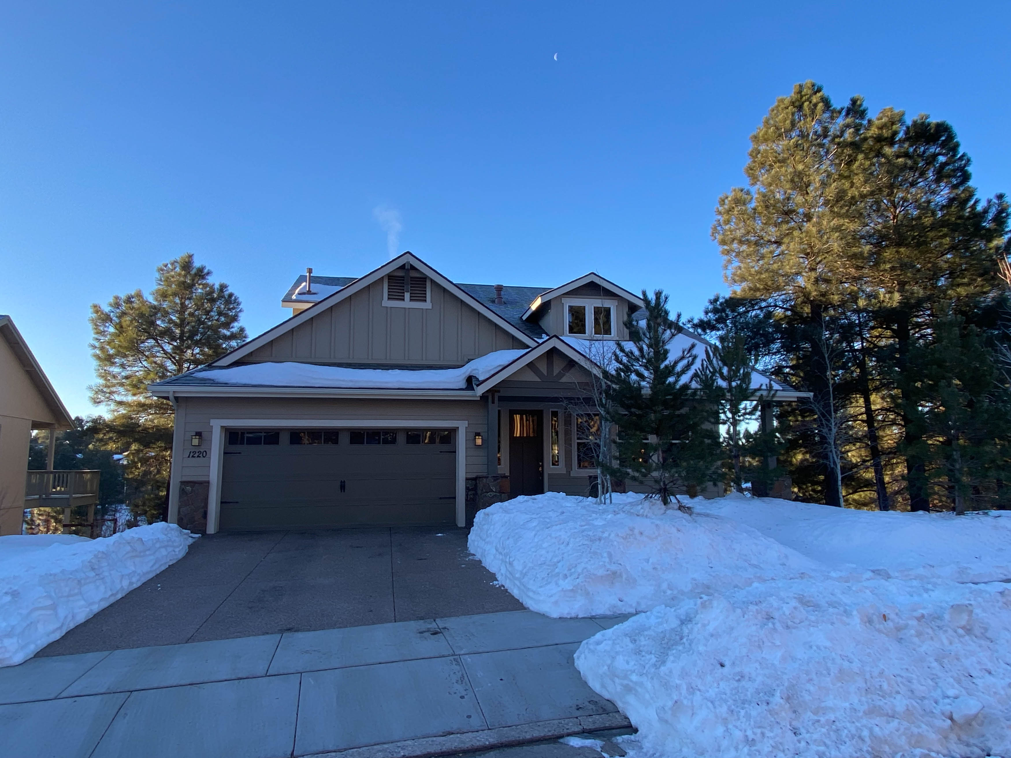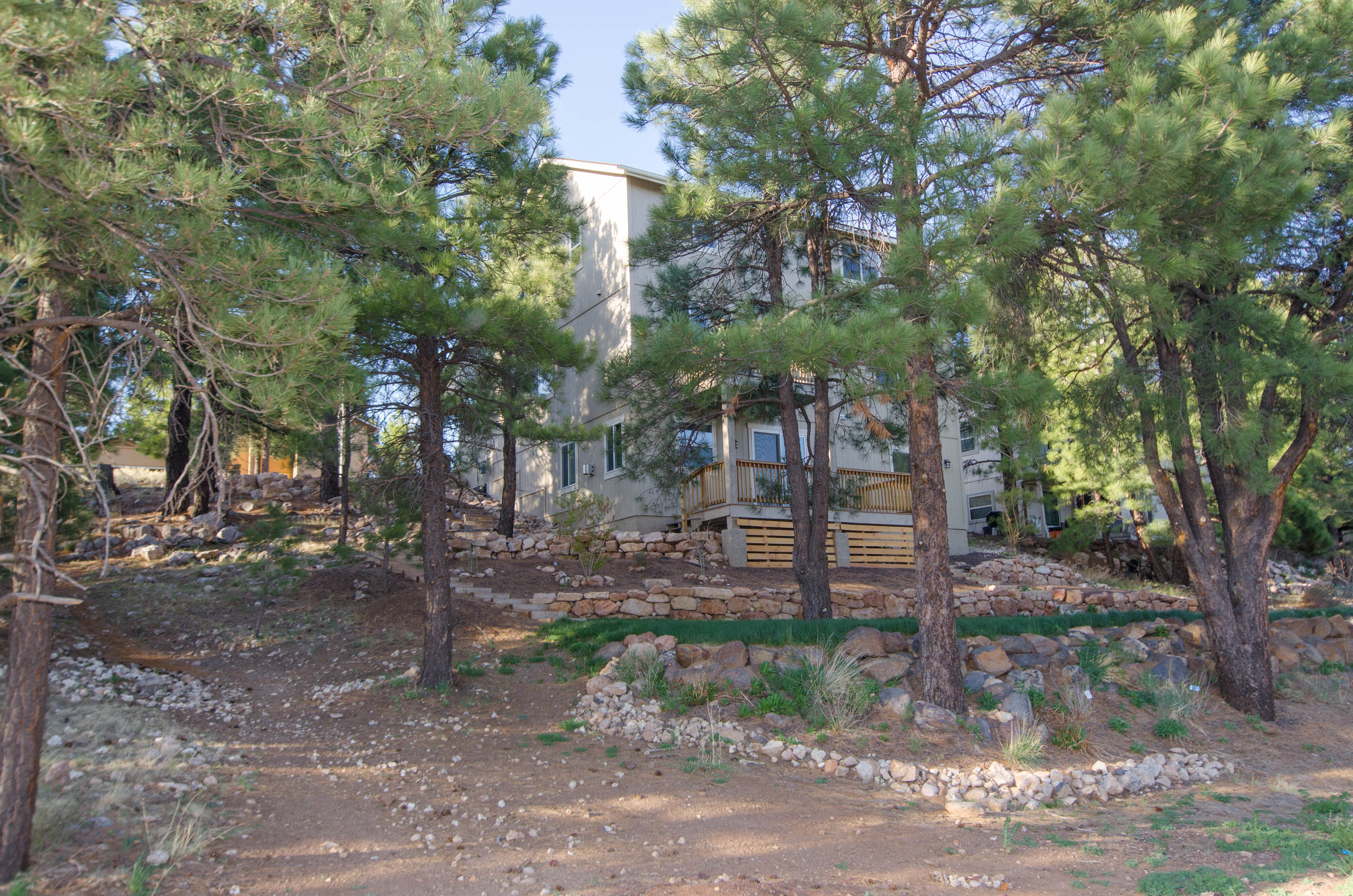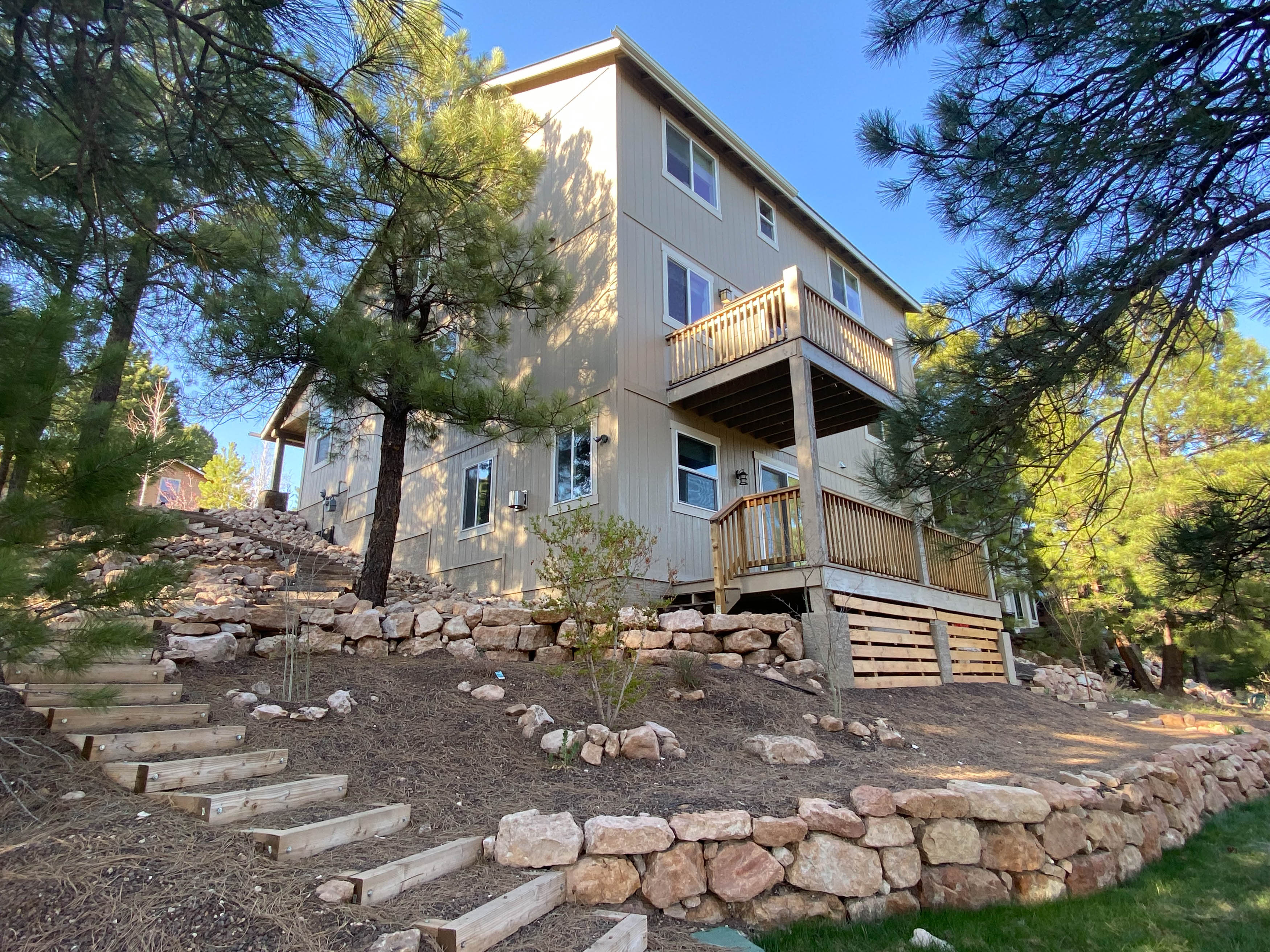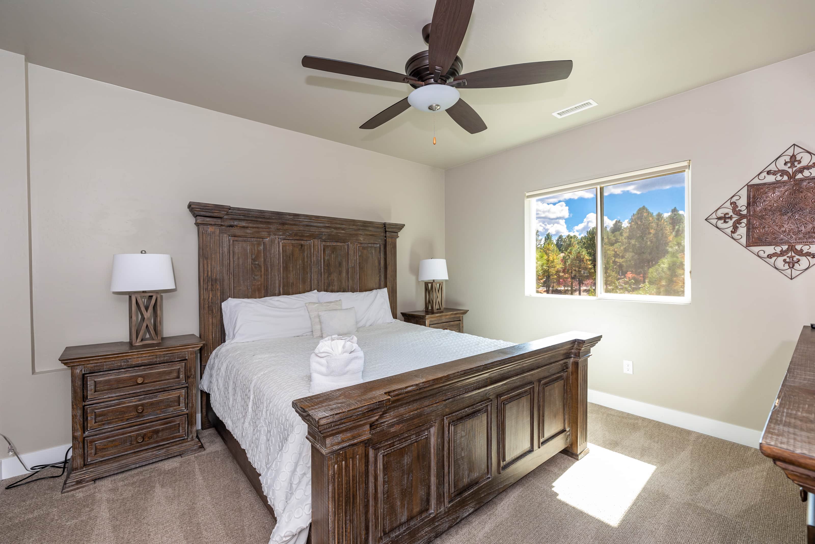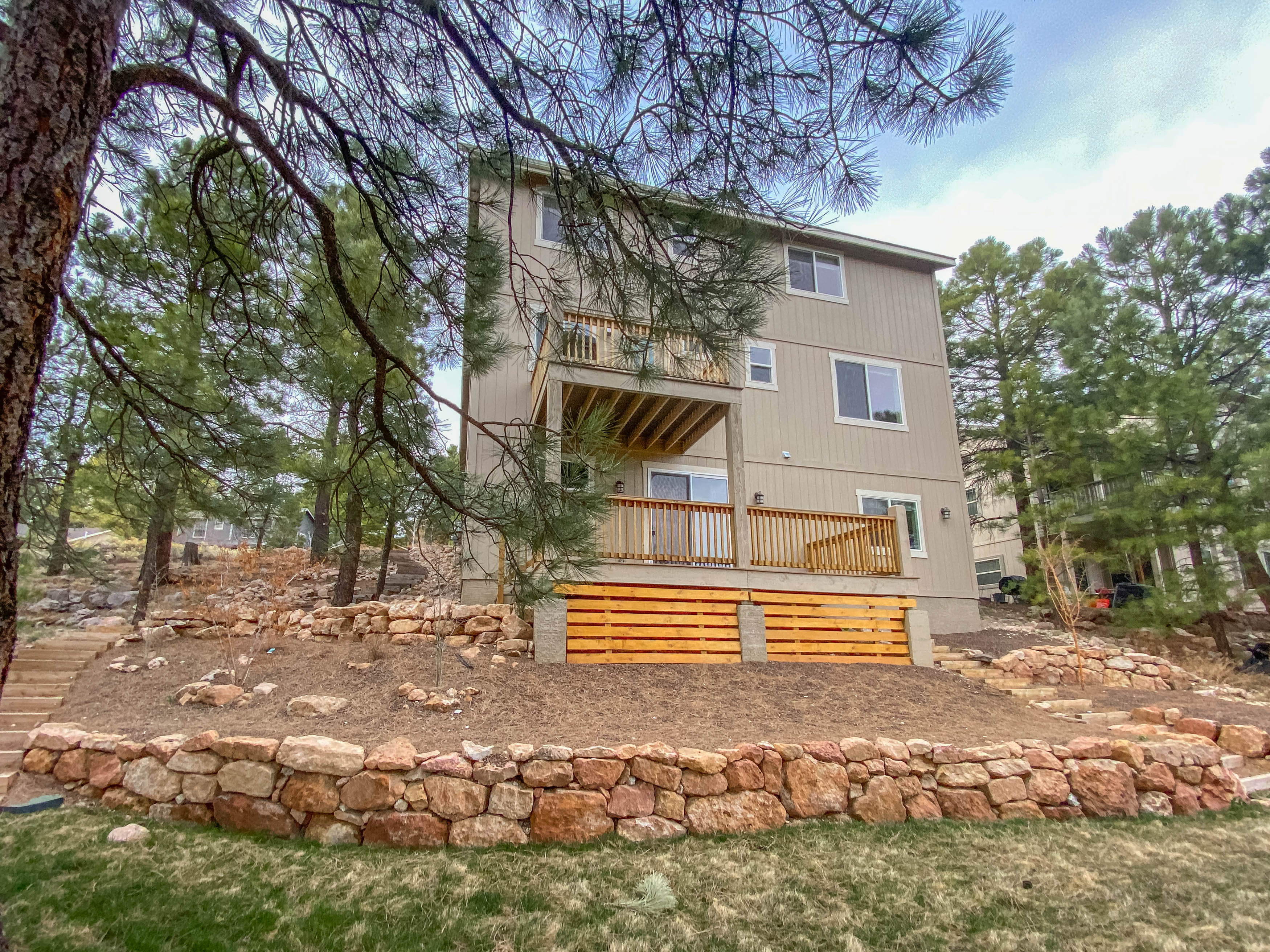 Amongst the high country pines and adjacent to a designated community open space this Flagstaff retreat is mountain living at its finest. The main level boasts an open concept floorplan with a grand fireplace, vaulted ceilings and a beautiful modern kitchen. The master suite is also located on the main level with an ensuite custom bathroom and large walk in closet. As you walk up the stairs and land on the upper level you are met by a large loft style landing, 3 additional large bedrooms with walk in closets, a full bathroom and a large laundry room. A fully finished 1207 s/f walk out basement is the icing on the cake with a large living/media room, adjacent office/gameroom, private bedroom, stylish bathroom and an amazing walkout deck. This home has 3 levels with the master bedroom featuring a king bed, living room, kitchen and dining area all on the main ground level. Upstairs you will find 3 bedroom along with the laundry room. The first of these bedrooms has a queen size bed and the remaining two each have a bunk beds with the lower bunk being a full size bed and the upper bunk having a twin size bed. Downstairs in the walk-out baseement area, you will find a 2nd master bedroom with king size bed. There are two large additional large living areas with large screen TVs, fireplace, balcony and even another bunk bed set with a full size lower bunk and twin upper. The home backs up to the community trail system with hiking and biking trails that will lead you to the community park (with a sled hill in the winter time) along with connecting with the Flagstaff Urban Trail System (FUTS) that has over 50 miles of hiking and biking trails through Flagstaff! Go explore!