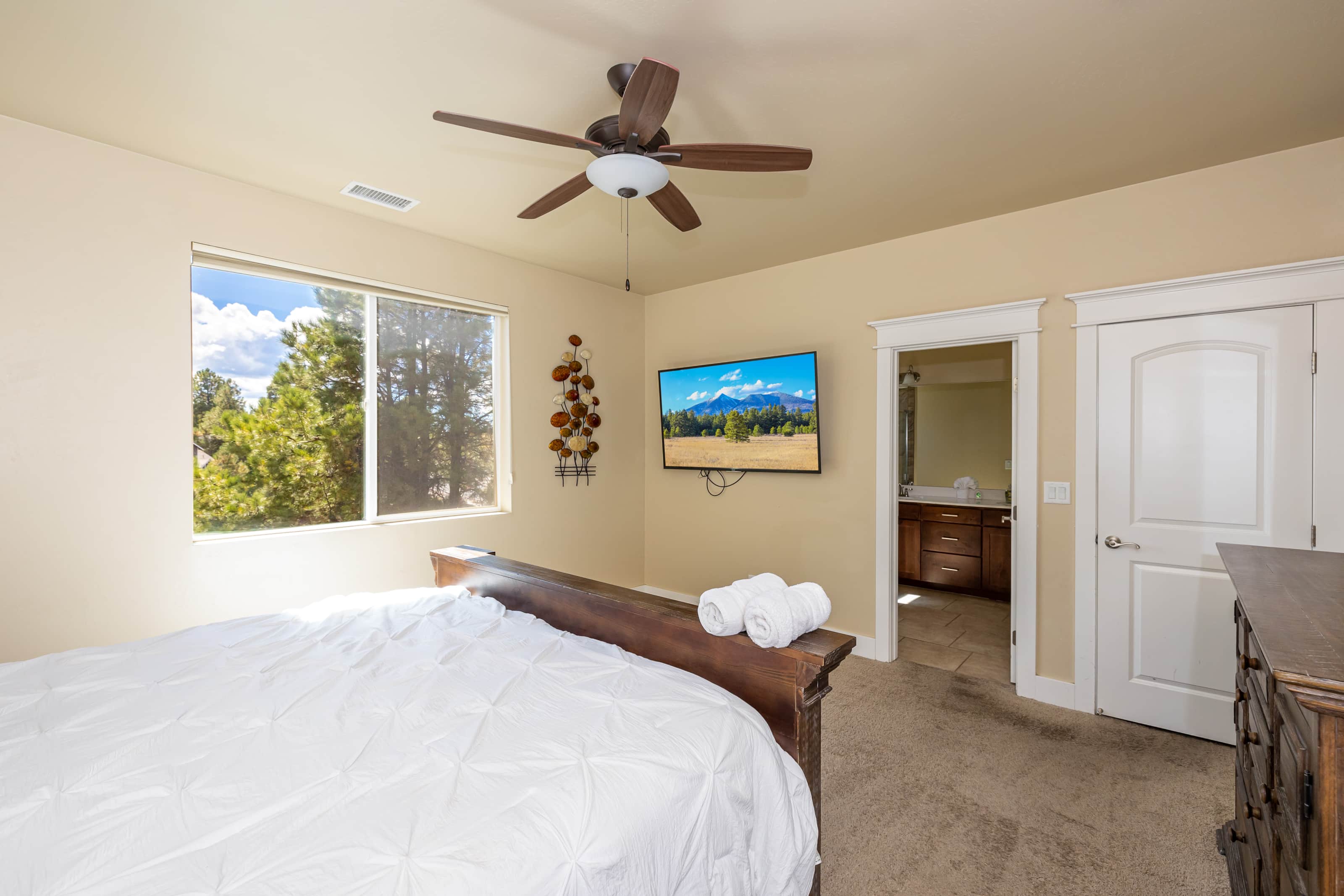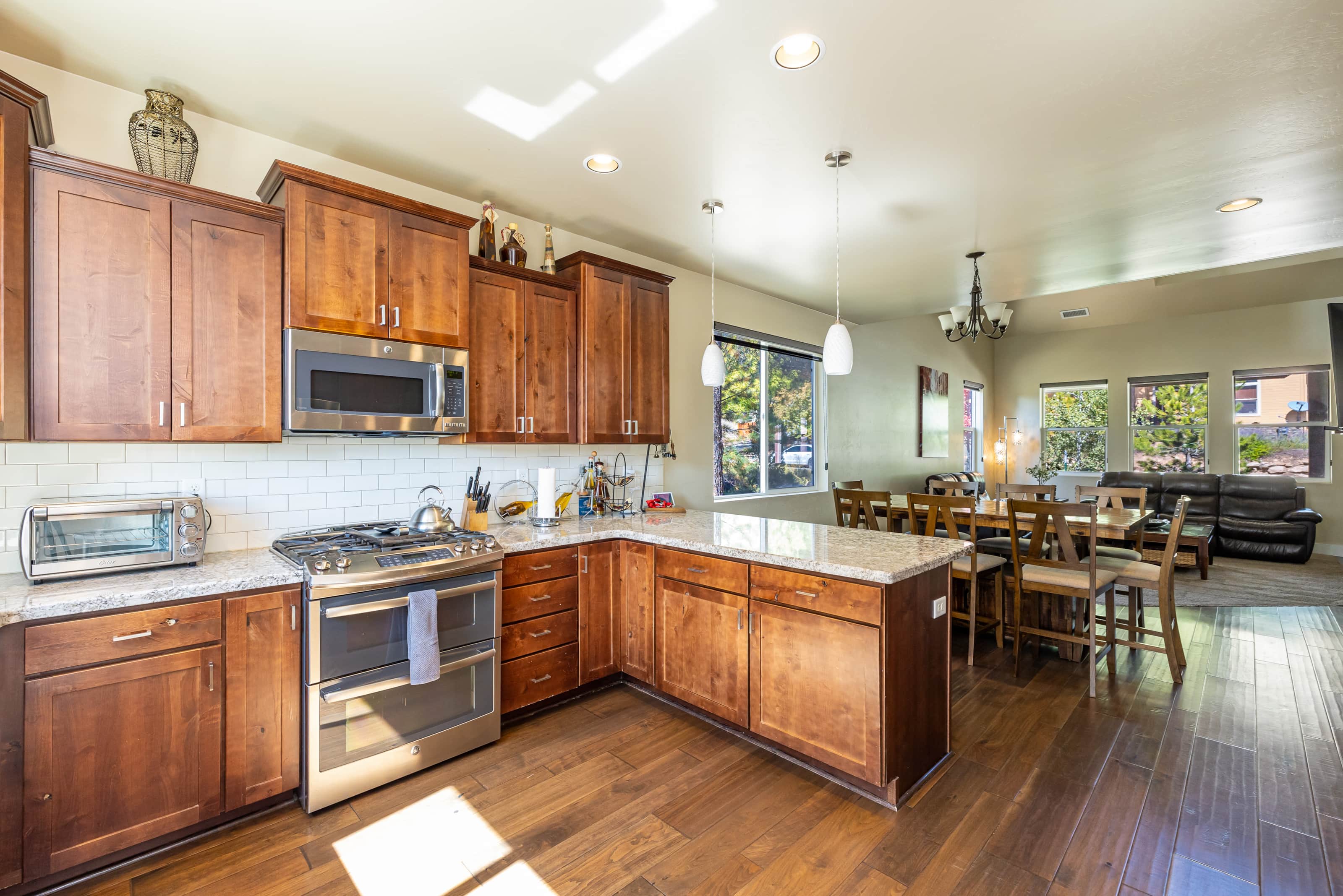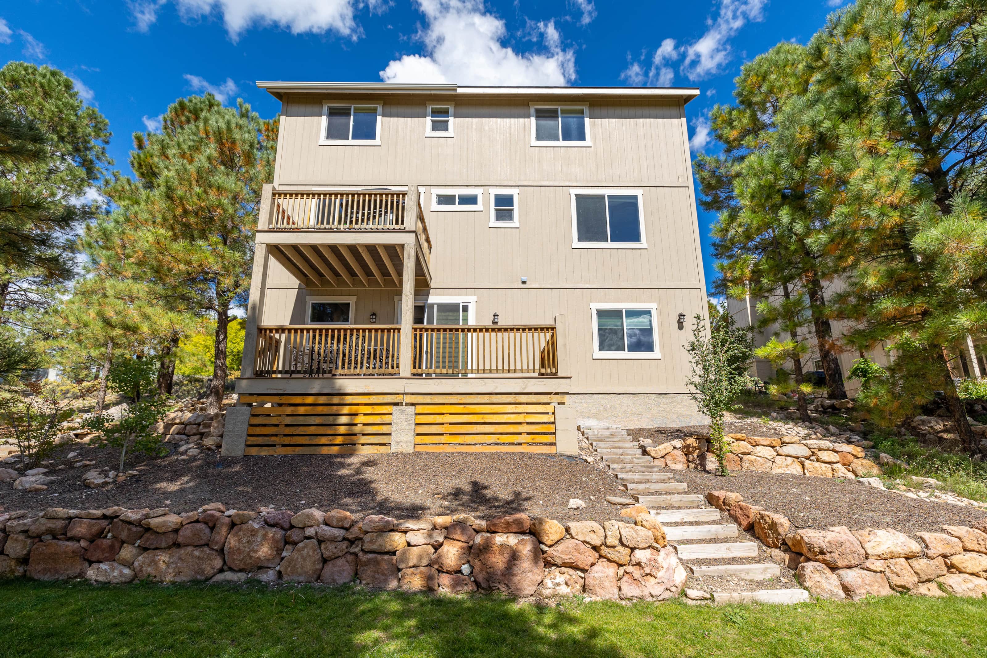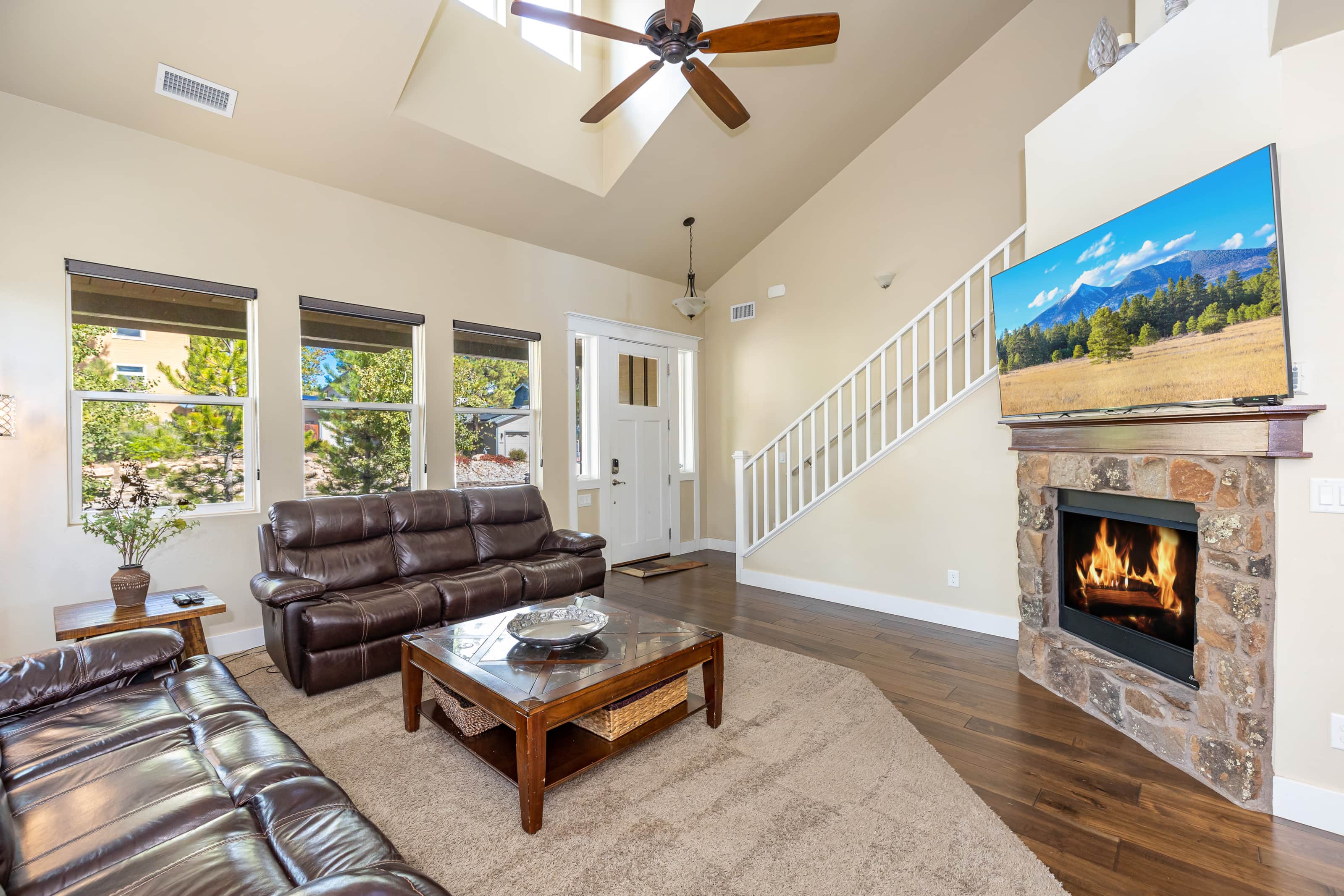 Amongst the high country pines and adjacent to a designated community open space this Flagstaff retreat is mountain living at its finest. The main level boasts an open concept floorplan with a grand fireplace, vaulted ceilings and a beautiful modern kitchen. The master suite is also located on the main level with an ensuite custom bathroom and large walk in closet. As you walk up the stairs and land on the upper level you are met by a large loft style landing, 3 additional large bedrooms with walk in closets, a full bathroom and a large laundry room. A fully finished 1207 s/f walk out basement is the icing on the cake with a large living/media room, adjacent office/gameroom, private bedroom, stylish bathroom and an amazing walkout deck. This home has 3 levels with the master bedroom featuring a king bed, living room, kitchen and dining area all on the main ground level. Upstairs you will find 3 bedroom along with the laundry room. The first of these bedrooms has a queen size bed and the remaining two each have a bunk beds with the lower bunk being a full size bed and the upper bunk having a twin size bed. Downstairs in the walk-out baseement area, you will find a 2nd master bedroom with king size bed. There are two large additional large living areas with large screen TVs, fireplace, balcony and even another bunk bed set with a full size lower bunk and twin upper. The home backs up to the community trail system with hiking and biking trails that will lead you to the community park (with a sled hill in the winter time) along with connecting with the Flagstaff Urban Trail System (FUTS) that has over 50 miles of hiking and biking trails through Flagstaff! Go explore!