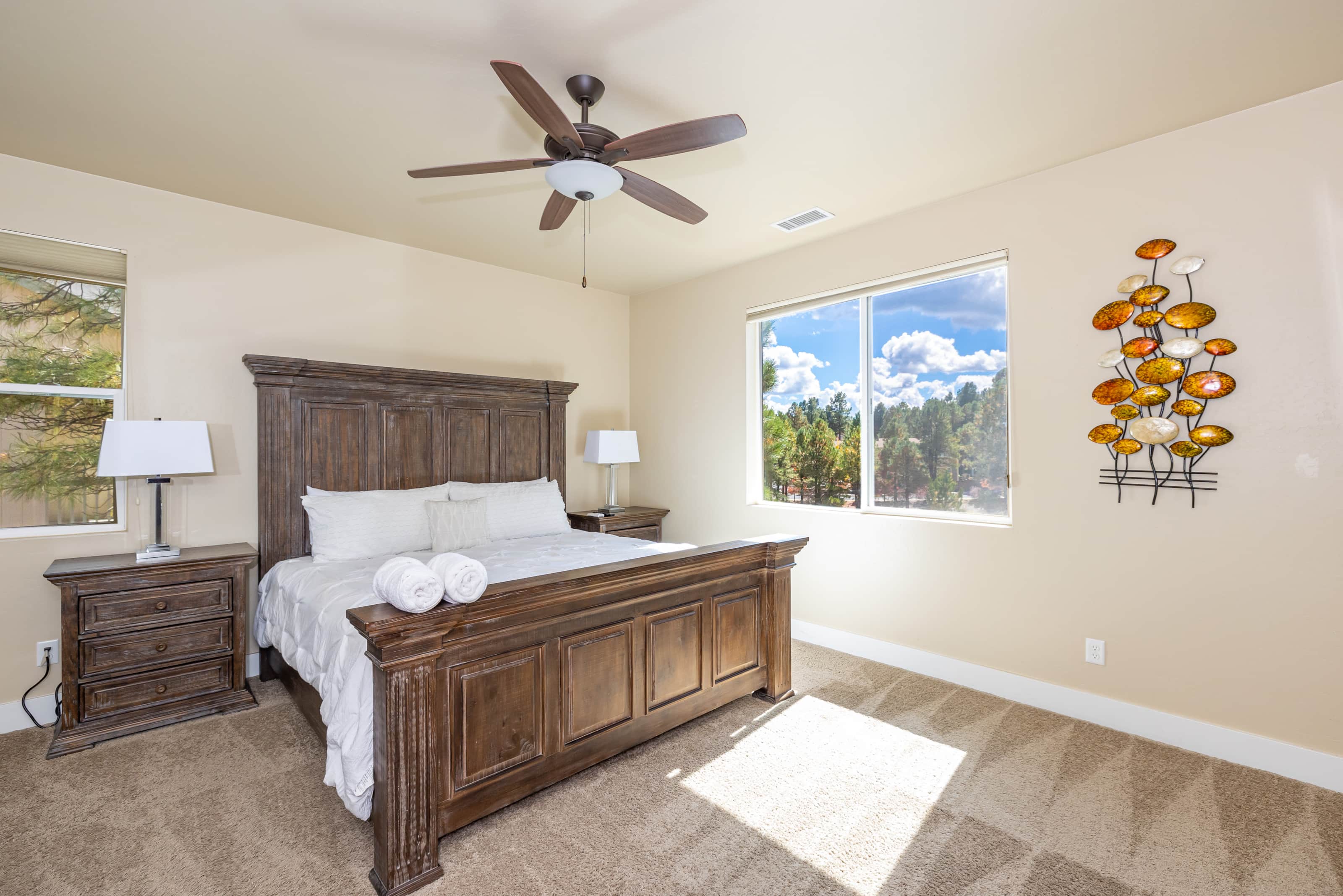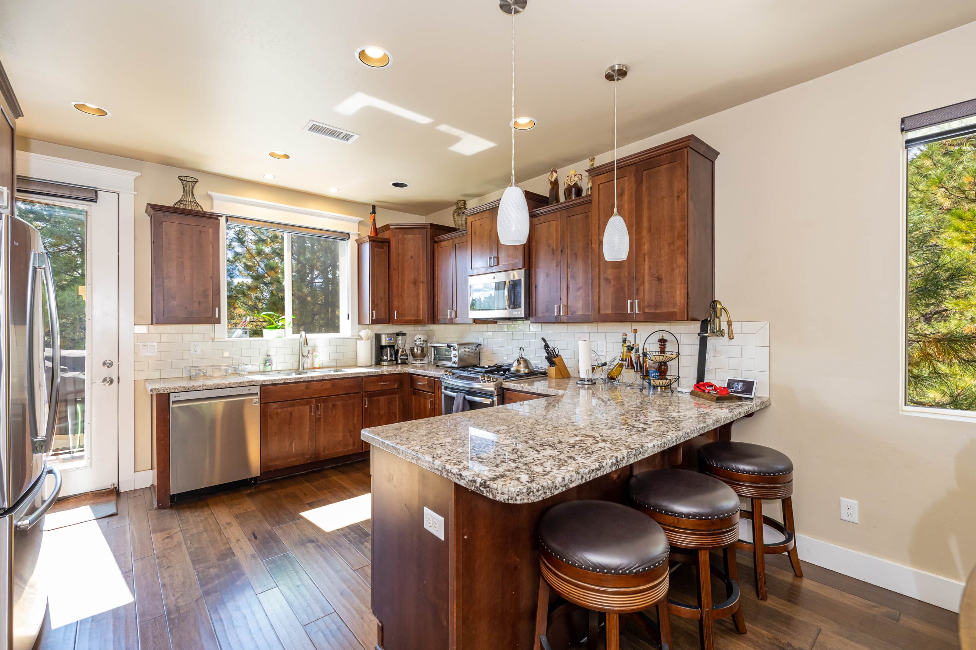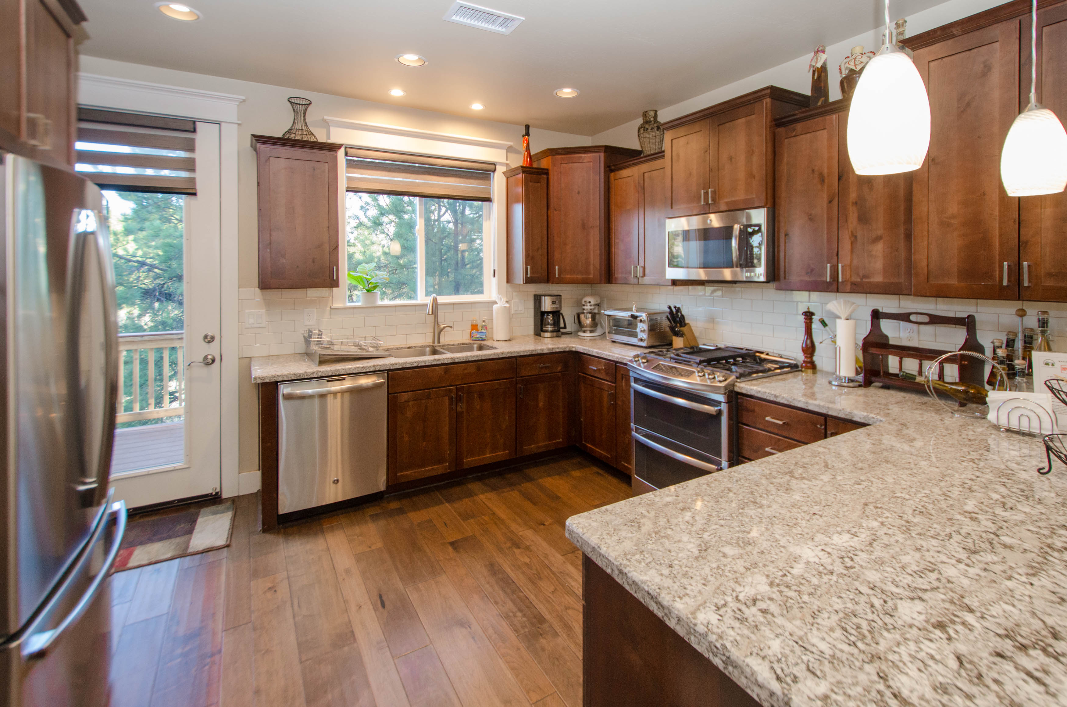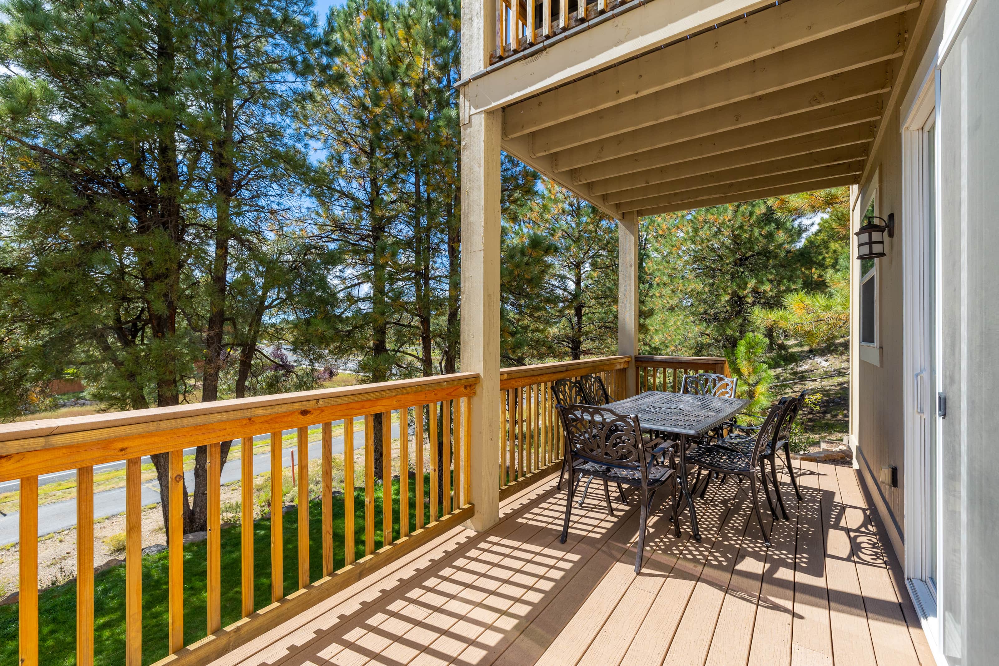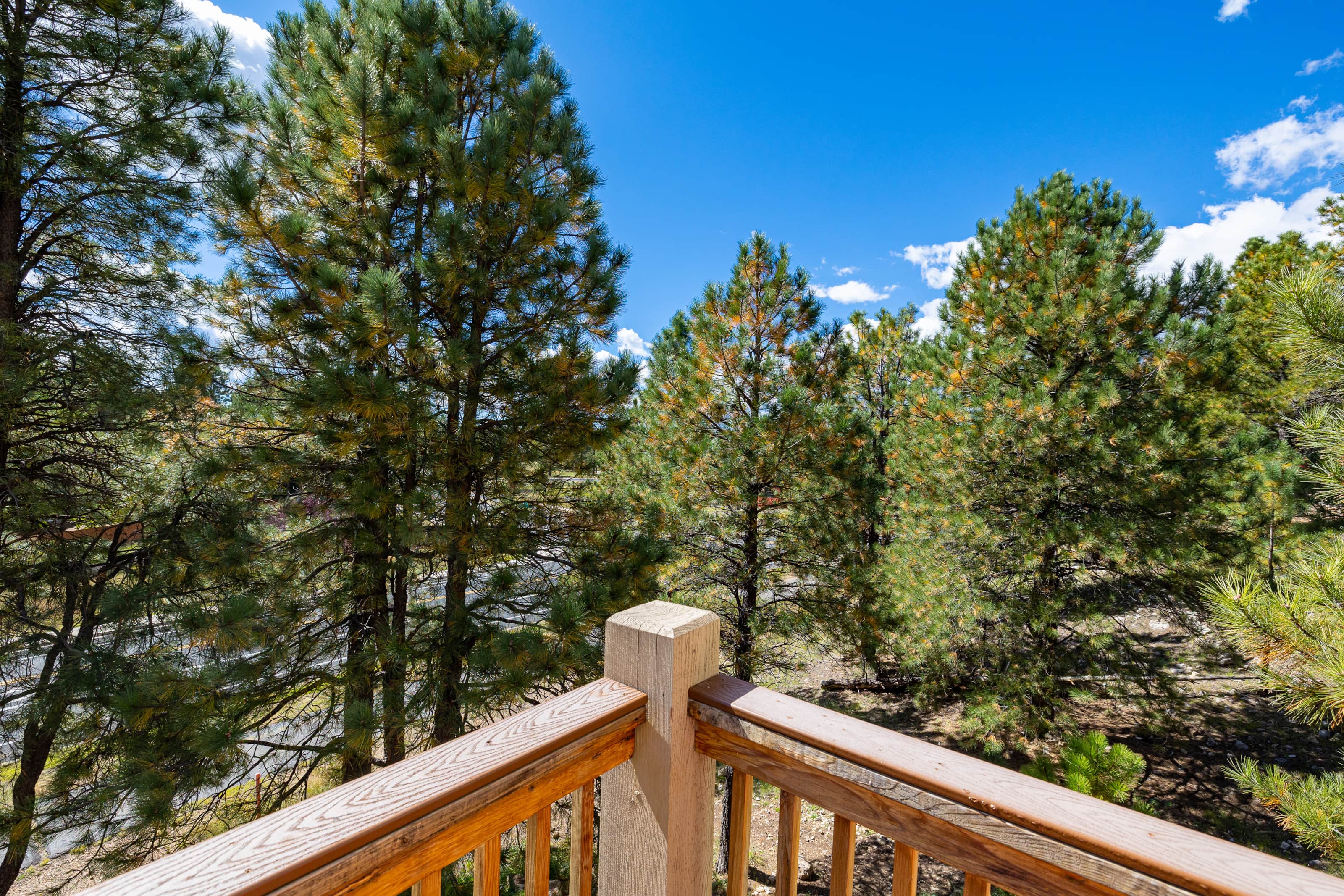 Amongst the high country pines and adjacent to a designated community open space this Flagstaff retreat is mountain living at its finest. The main level boasts an open concept floorplan with a grand fireplace, vaulted ceilings and a beautiful modern kitchen. The master suite is also located on the main level with an ensuite custom bathroom and large walk in closet. As you walk up the stairs and land on the upper level you are met by a large loft style landing, 3 additional large bedrooms with walk in closets, a full bathroom and a large laundry room. A fully finished 1207 s/f walk out basement is the icing on the cake with a large living/media room, adjacent office/gameroom, private bedroom, stylish bathroom and an amazing walkout deck. This home has 3 levels with the master bedroom featuring a king bed, living room, kitchen and dining area all on the main ground level. Upstairs you will find 3 bedroom along with the laundry room. The first of these bedrooms has a queen size bed and the remaining two each have a bunk beds with the lower bunk being a full size bed and the upper bunk having a twin size bed. Downstairs in the walk-out baseement area, you will find a 2nd master bedroom with king size bed. There are two large additional large living areas with large screen TVs, fireplace, balcony and even another bunk bed set with a full size lower bunk and twin upper. The home backs up to the community trail system with hiking and biking trails that will lead you to the community park (with a sled hill in the winter time) along with connecting with the Flagstaff Urban Trail System (FUTS) that has over 50 miles of hiking and biking trails through Flagstaff! Go explore!