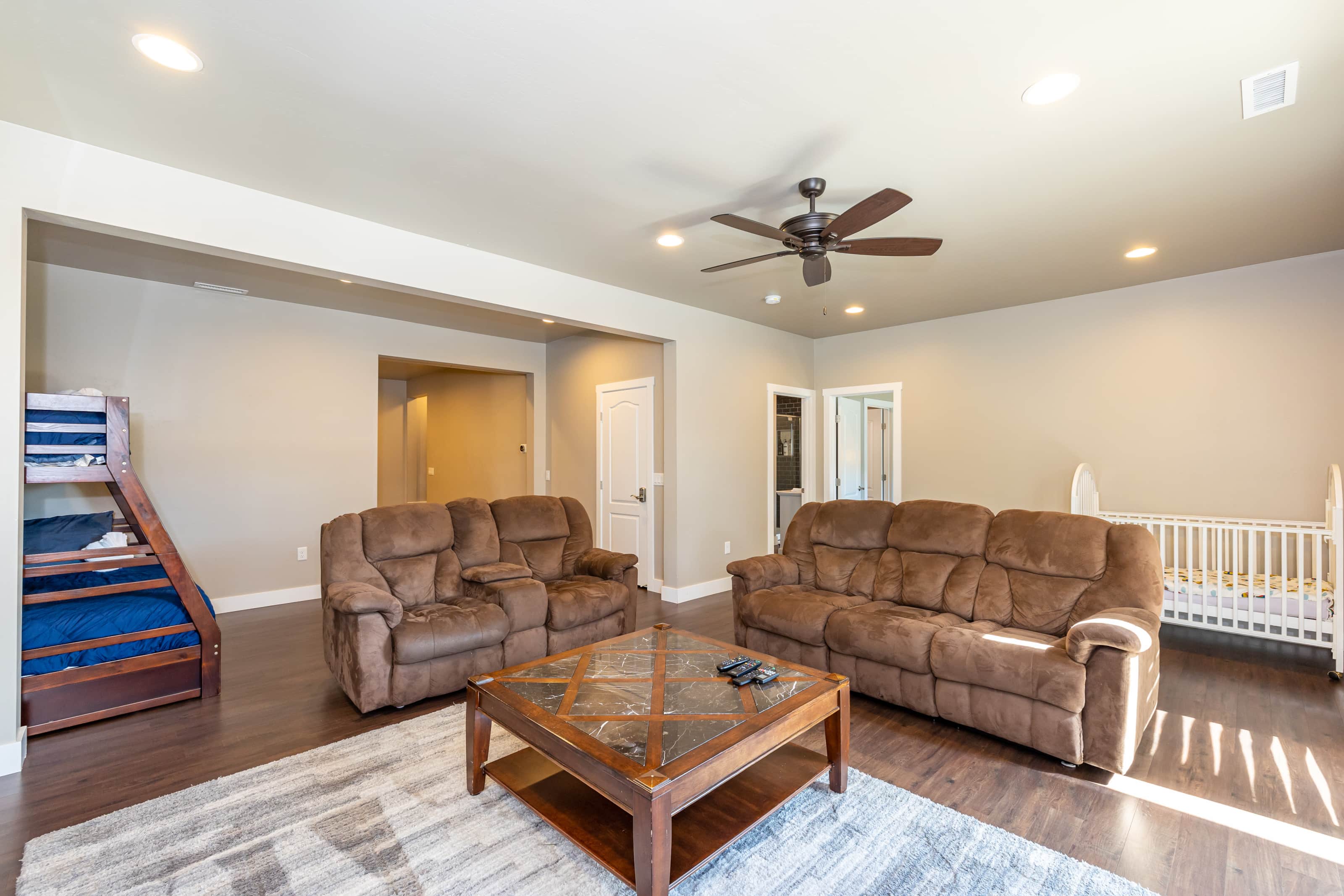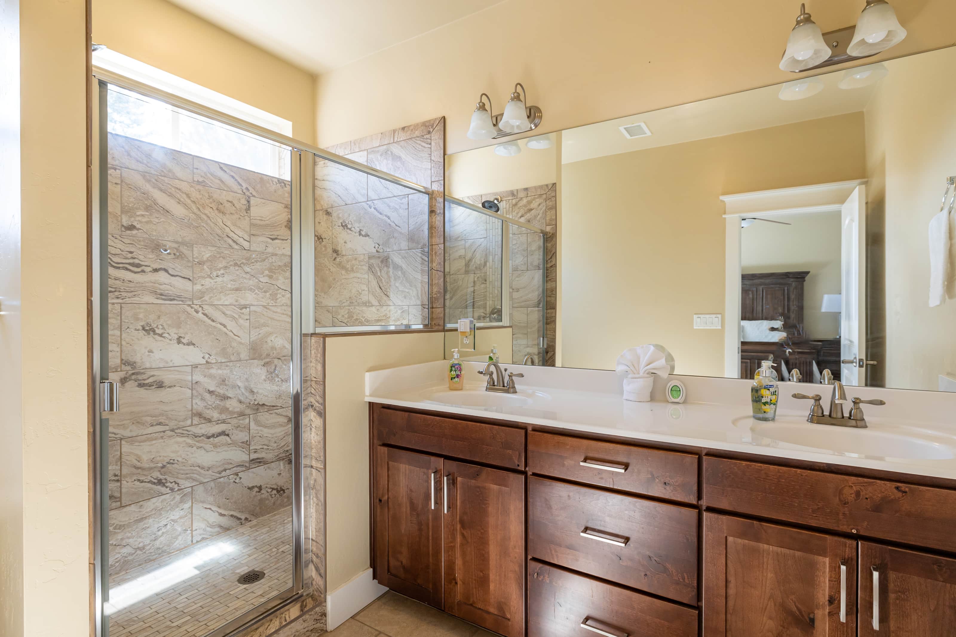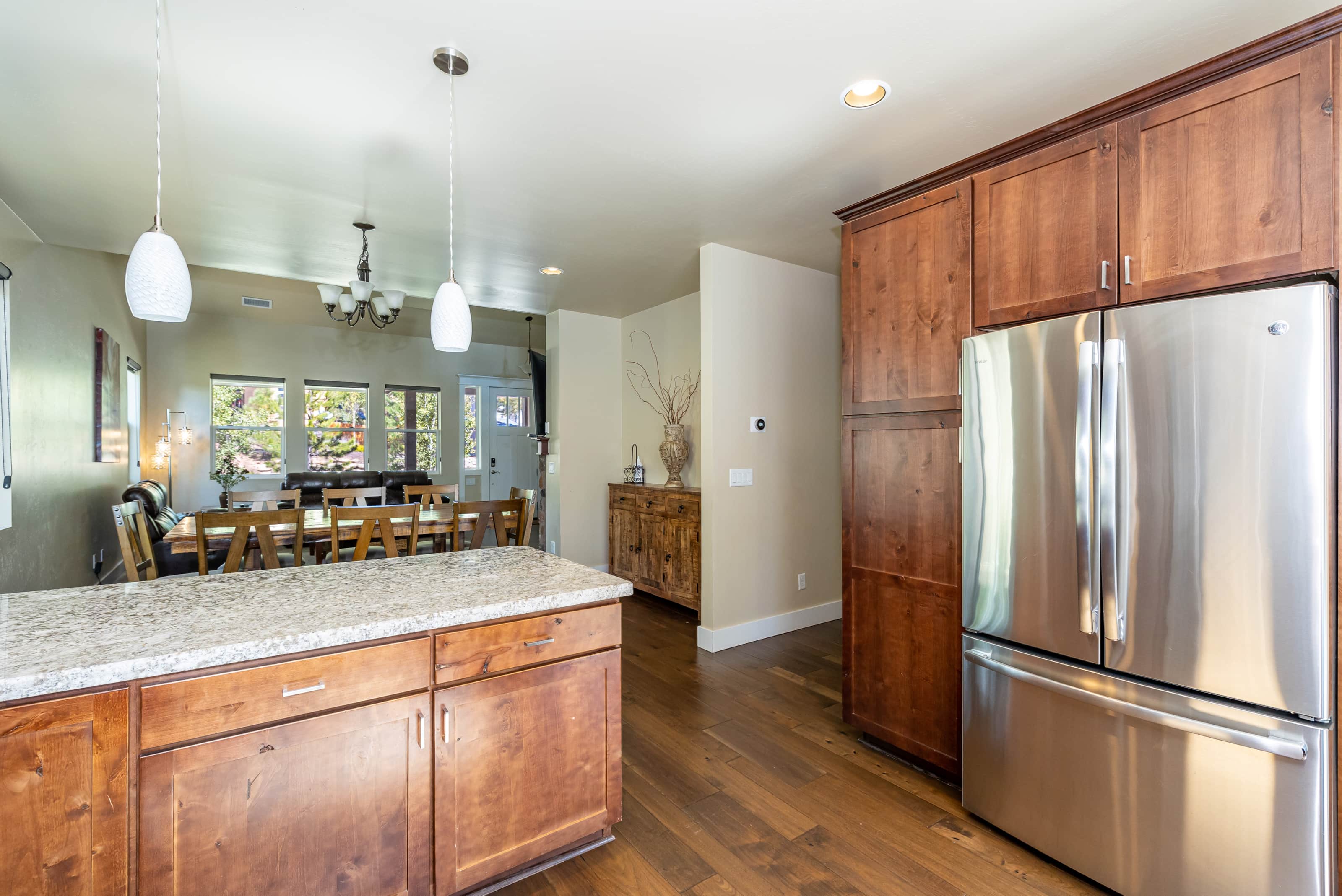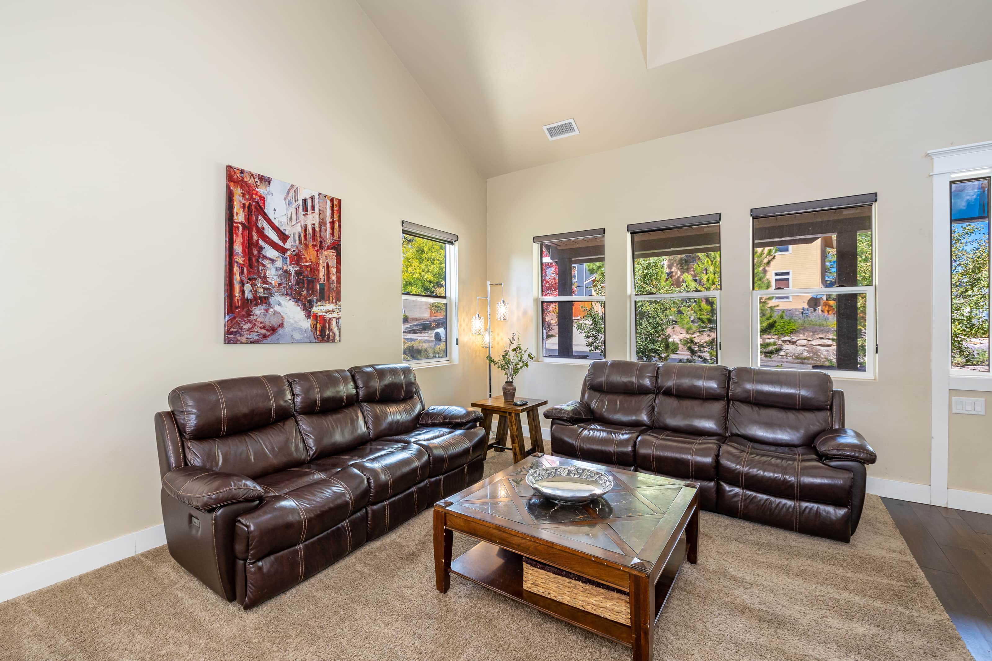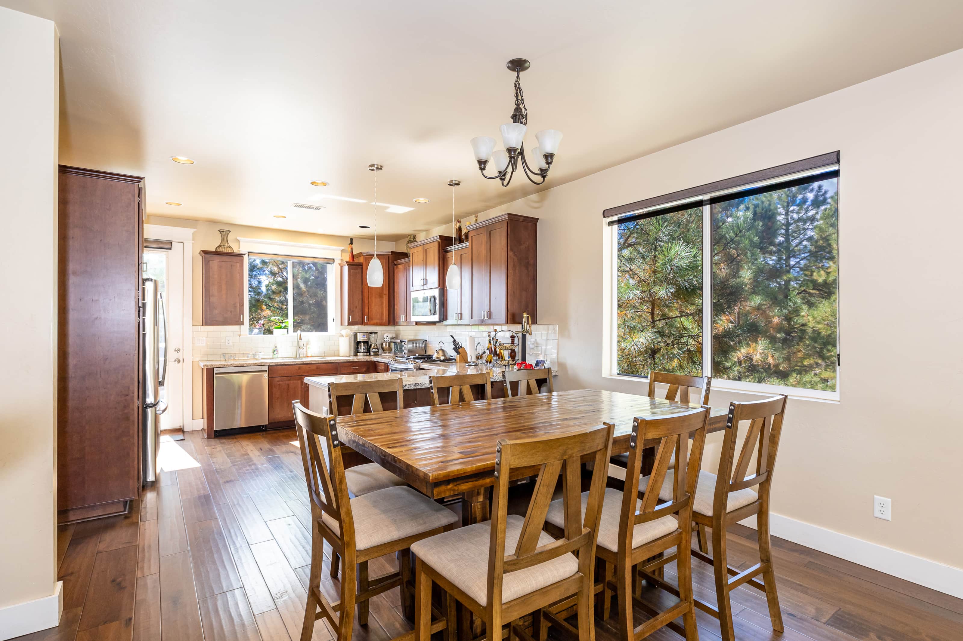 Amongst the high country pines and adjacent to a designated community open space this Flagstaff retreat is mountain living at its finest. The main level boasts an open concept floorplan with a grand fireplace, vaulted ceilings and a beautiful modern kitchen. The master suite is also located on the main level with an ensuite custom bathroom and large walk in closet. As you walk up the stairs and land on the upper level you are met by a large loft style landing, 3 additional large bedrooms with walk in closets, a full bathroom and a large laundry room. A fully finished 1207 s/f walk out basement is the icing on the cake with a large living/media room, adjacent office/gameroom, private bedroom, stylish bathroom and an amazing walkout deck. This home has 3 levels with the master bedroom featuring a king bed, living room, kitchen and dining area all on the main ground level. Upstairs you will find 3 bedroom along with the laundry room. The first of these bedrooms has a queen size bed and the remaining two each have a bunk beds with the lower bunk being a full size bed and the upper bunk having a twin size bed. Downstairs in the walk-out baseement area, you will find a 2nd master bedroom with king size bed. There are two large additional large living areas with large screen TVs, fireplace, balcony and even another bunk bed set with a full size lower bunk and twin upper. The home backs up to the community trail system with hiking and biking trails that will lead you to the community park (with a sled hill in the winter time) along with connecting with the Flagstaff Urban Trail System (FUTS) that has over 50 miles of hiking and biking trails through Flagstaff! Go explore!